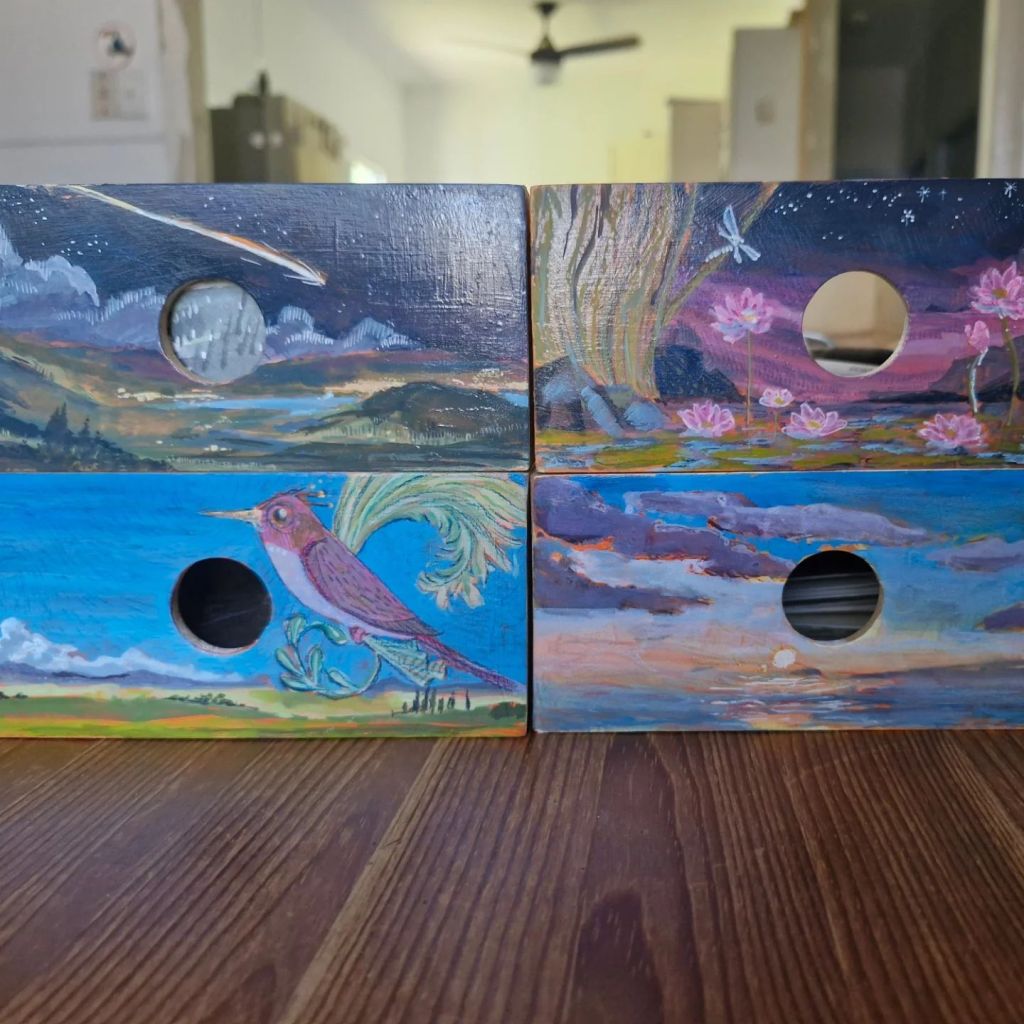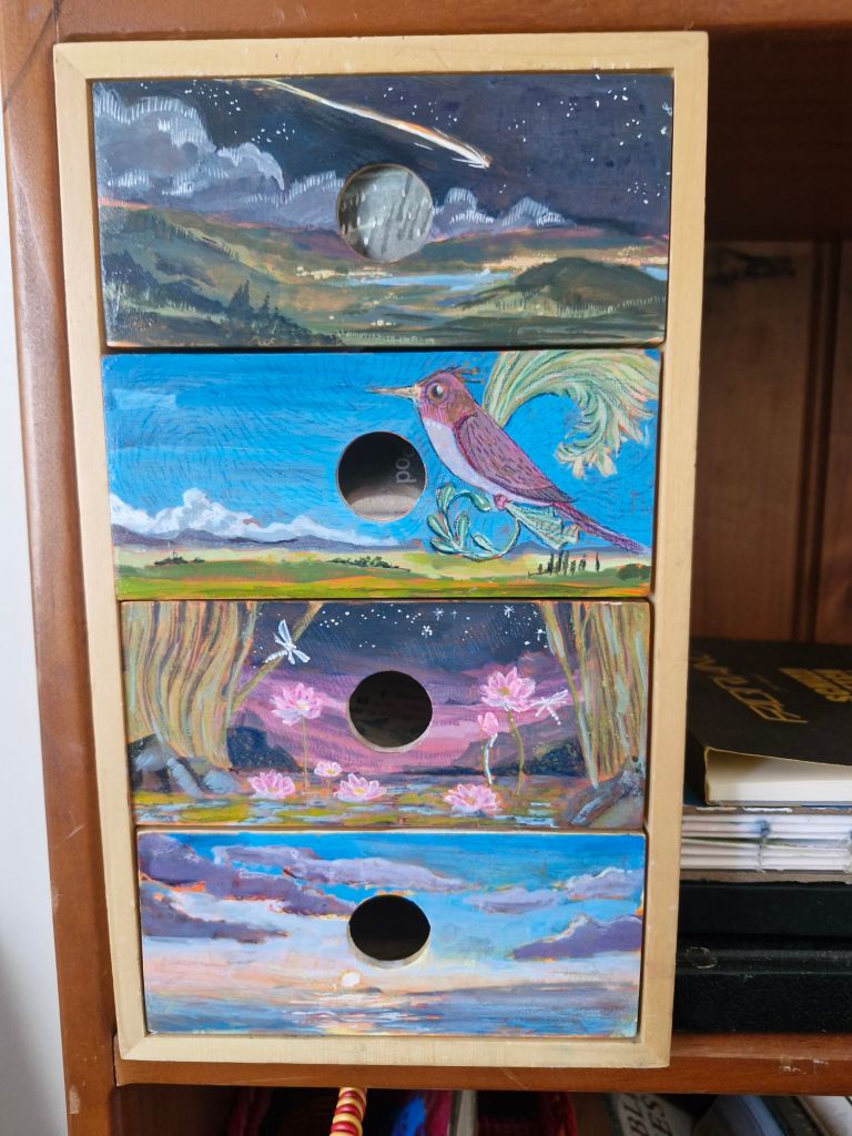 So, what have instead been working on? Primarily freshening up a set of drawers that o have had forever. Made of pine, it has housed my coloured pencils, a sticker collection, and a surprisingly small ‘doom pile’. After all this time, it was starting to look a tad forlorn. So, with some sanding, priming, and splashes of gouache, it is done! 🤩