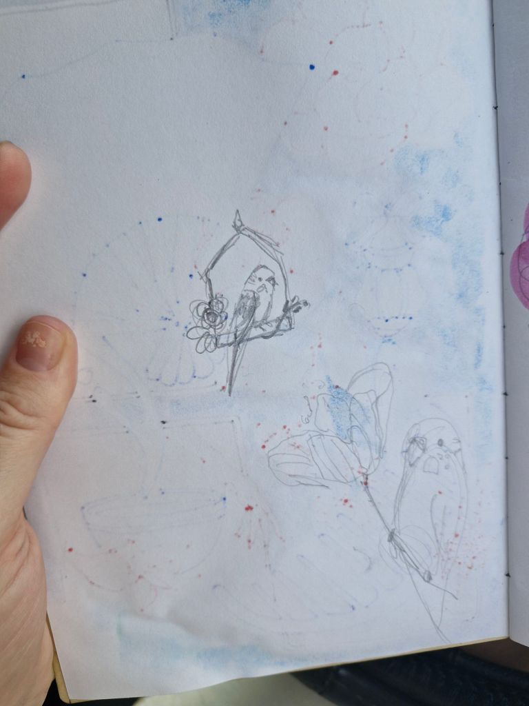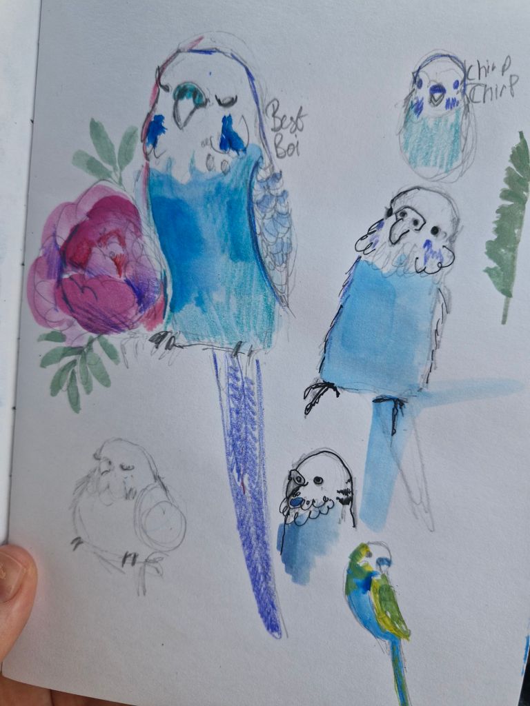 This week, I have just been having fun, trying not to be too serious with my art. We have brought our budgie inside due to the heat, and he’s become a bit of inspiration.